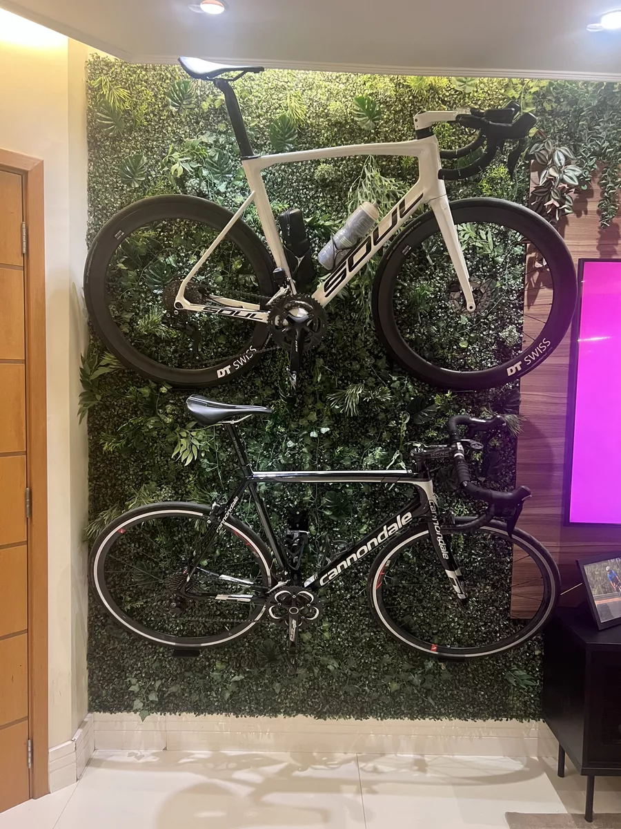 A bike fica firme e segura através dos apoios dos pneus e do suporte de pedal, de fácil instalação a bicicleta é pendurada com inclinação em relação a parede, aproveitando melhor o espaço e dando sensação de movimento.